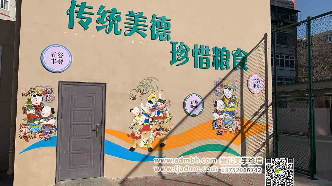 為天津市北辰區(qū)引河里小學(xué)畫的墻體彩繪!客戶要求再操場畫楊柳青年畫風(fēng)格小孩玩耍的場景畫面,所以根據(jù)現(xiàn)場墻面條件,設(shè)計了一款墻繪效果圖,符合現(xiàn)場墻繪造型位置感覺,看起來舒服,畫后也得到校長好評。
